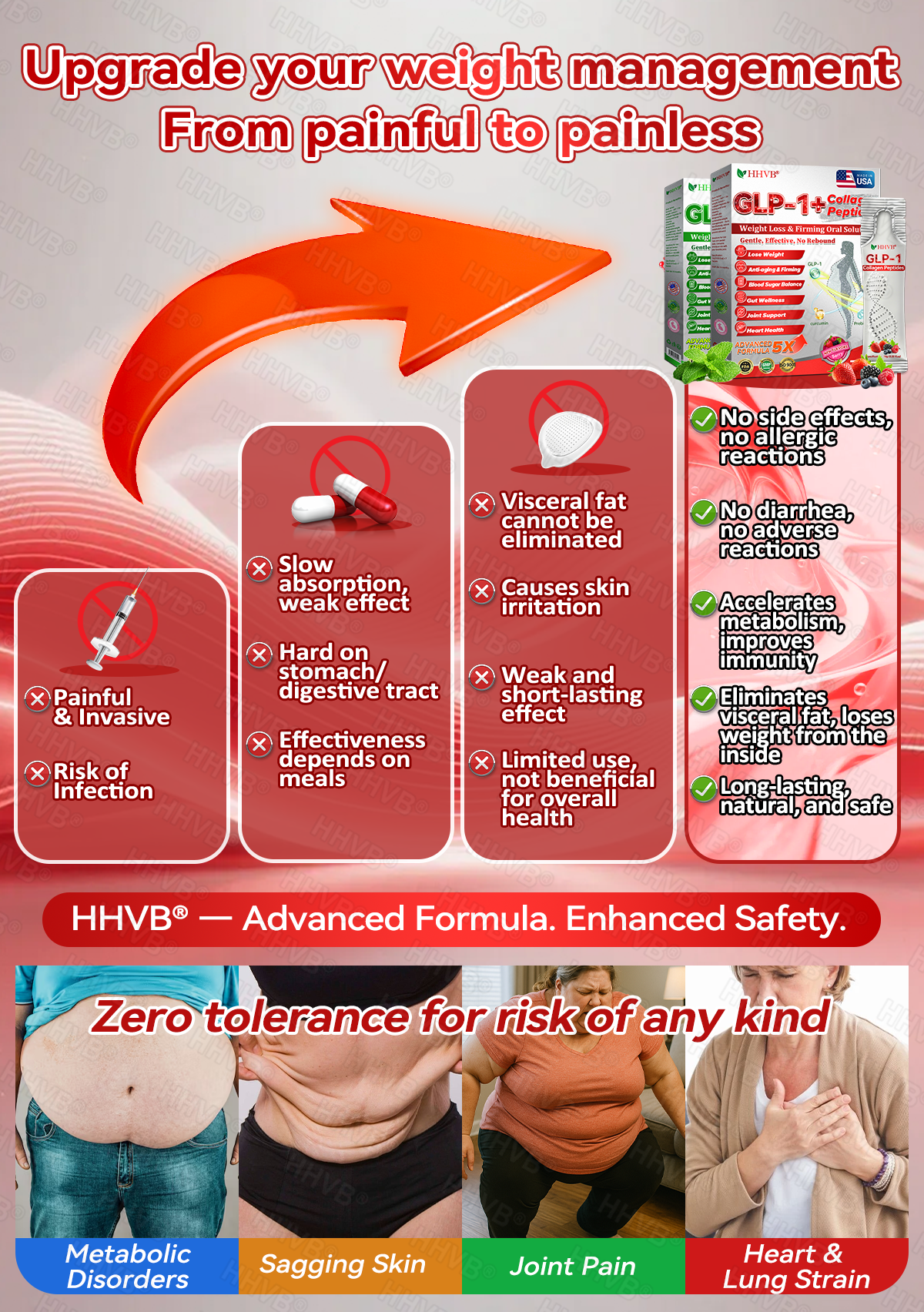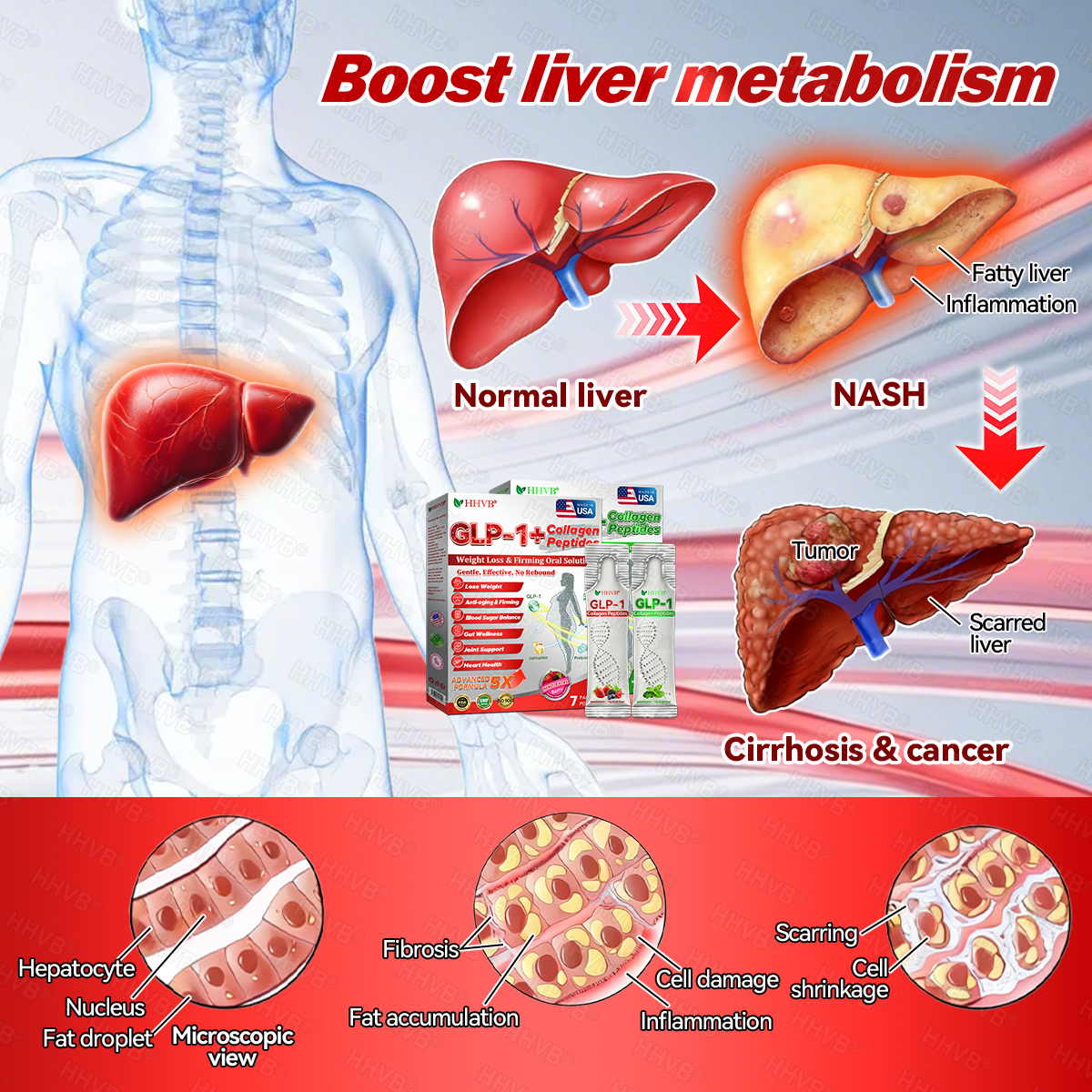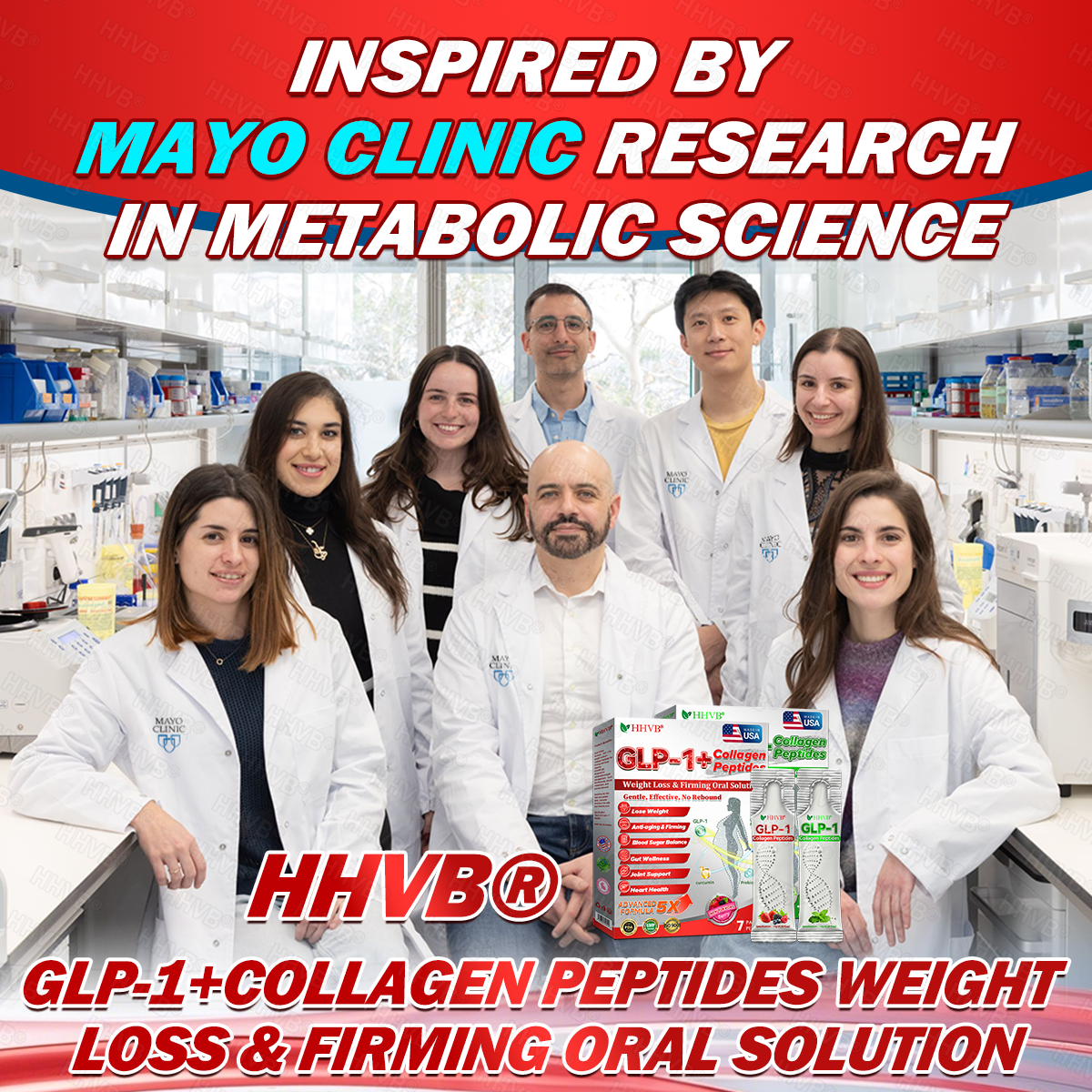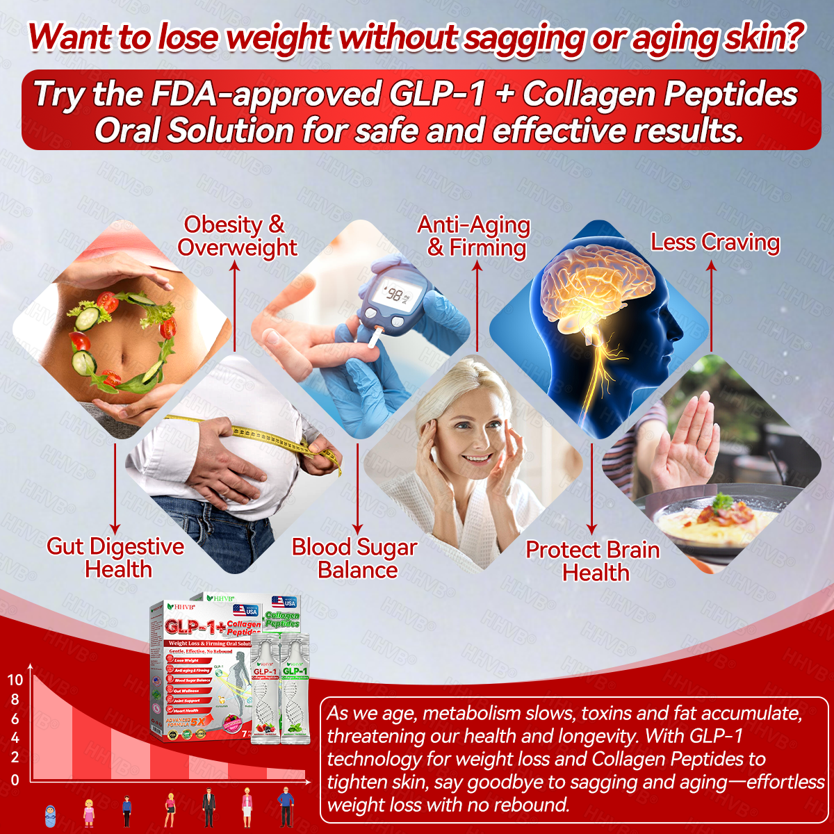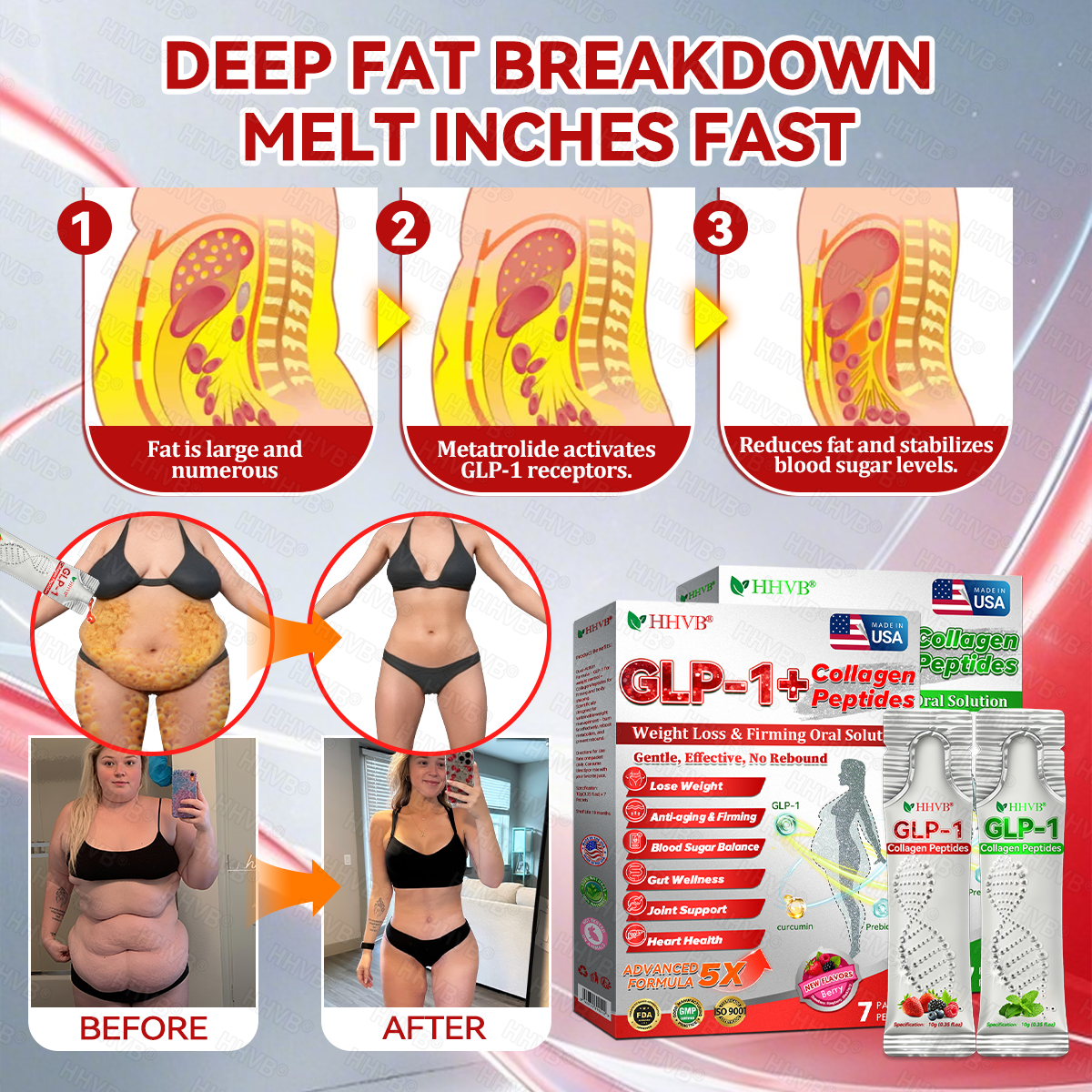 HHVB®GLP-1+Collagen Peptides Weight Loss&Firming Oral Solution Developed by an international team of metabolic and endocrinology experts, the GLP-1 + Collagen Peptides Oral Solution represents a groundbreaking synergy in weight management and skin regeneration.GLP-1 technology precisely targets the body’s metabolic center to regulate appetite, accelerate fat breakdown, and restore energy balance. Meanwhile, Collagen Peptides work deep within the dermis to repair structural loss caused by fat reduction, rebuilding the skin’s support network and visibly improving firmness and elasticity.Clinical studies demonstrate that this dual-action formula delivers measurable results—reducing body fat while enhancing skin tightness within a short period of use. It offers a scientifically validated solution for sustainable health, firmness, and long-lasting vitality.