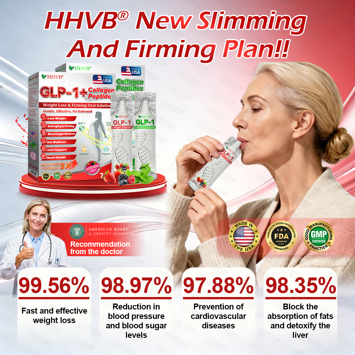 Clinically validated by endocrinologists, HHVB® GLP-1 + Collagen Peptides Oral Solution delivers visible improvements in obesity, skin firmness, and overall health within just 7 days.