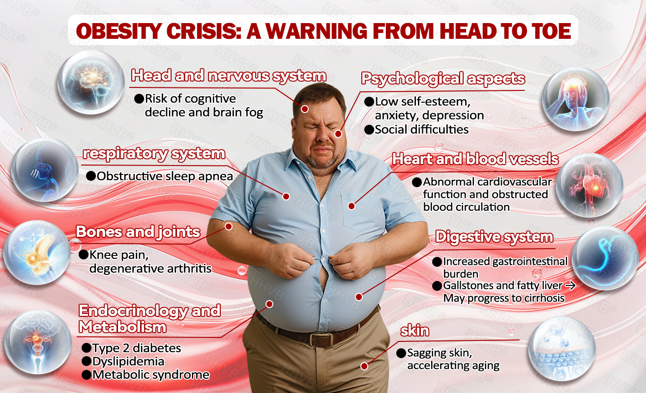 The root cause of obesity lies in hormonal imbalances and metabolic dysfunction. A sluggish thyroid reduces fat-burning efficiency, while chronic stress elevates cortisol levels, leading to excess abdominal fat. Insulin resistance causes excess sugar to be stored as fat, and poor lymphatic circulation results in toxin and fluid retention, exacerbating bloating and fat accumulation. Additionally, impaired leptin regulation in the liver disrupts satiety signals, driving overeating and creating a vicious cycle. Modern lifestyle factors—high-sugar, high-fat diets, sleep deprivation, and lack of physical activity—further slow metabolism, making fat even harder to burn. Over time, obesity doesn’t just affect appearance; it also increases the risk of serious health issues, making early intervention crucial.