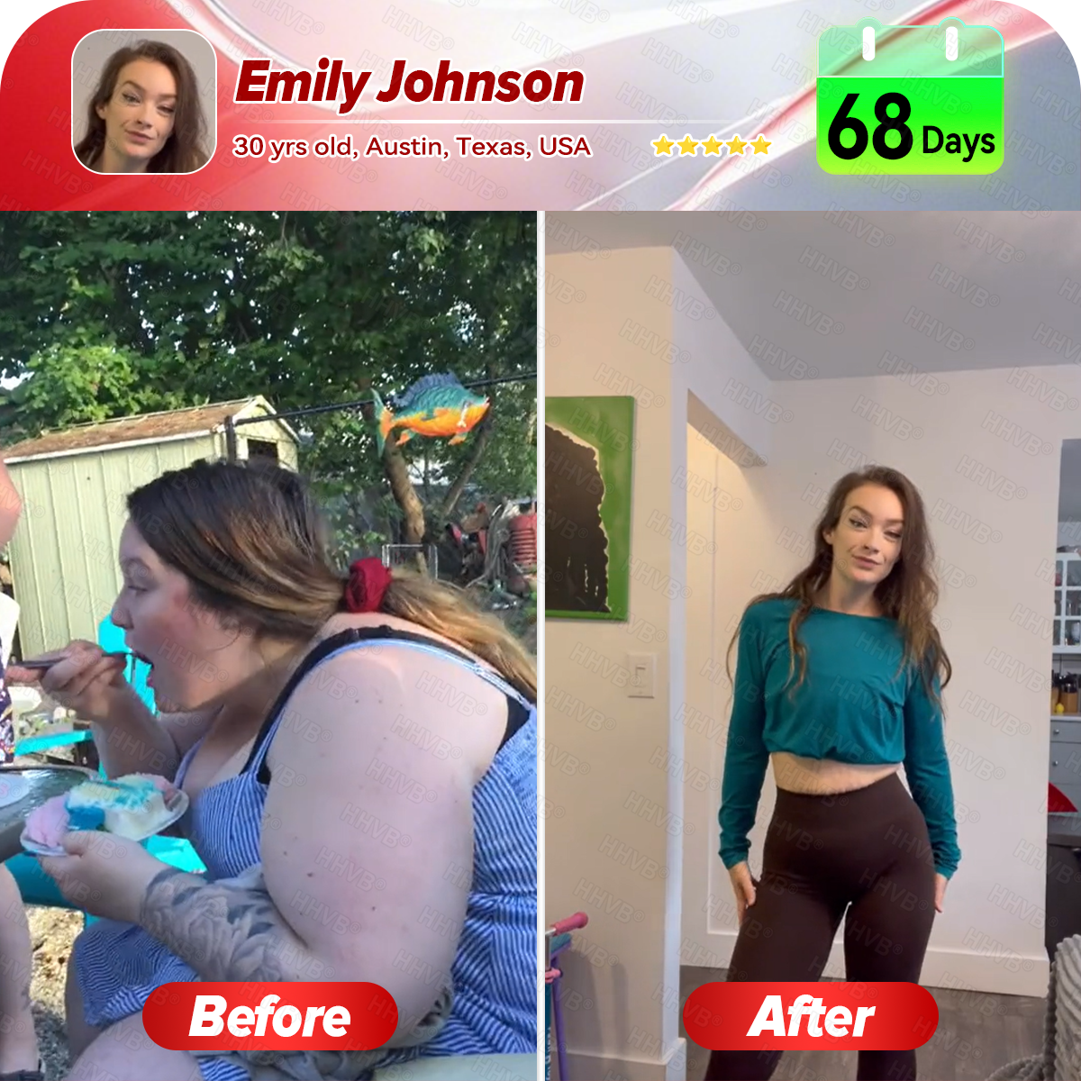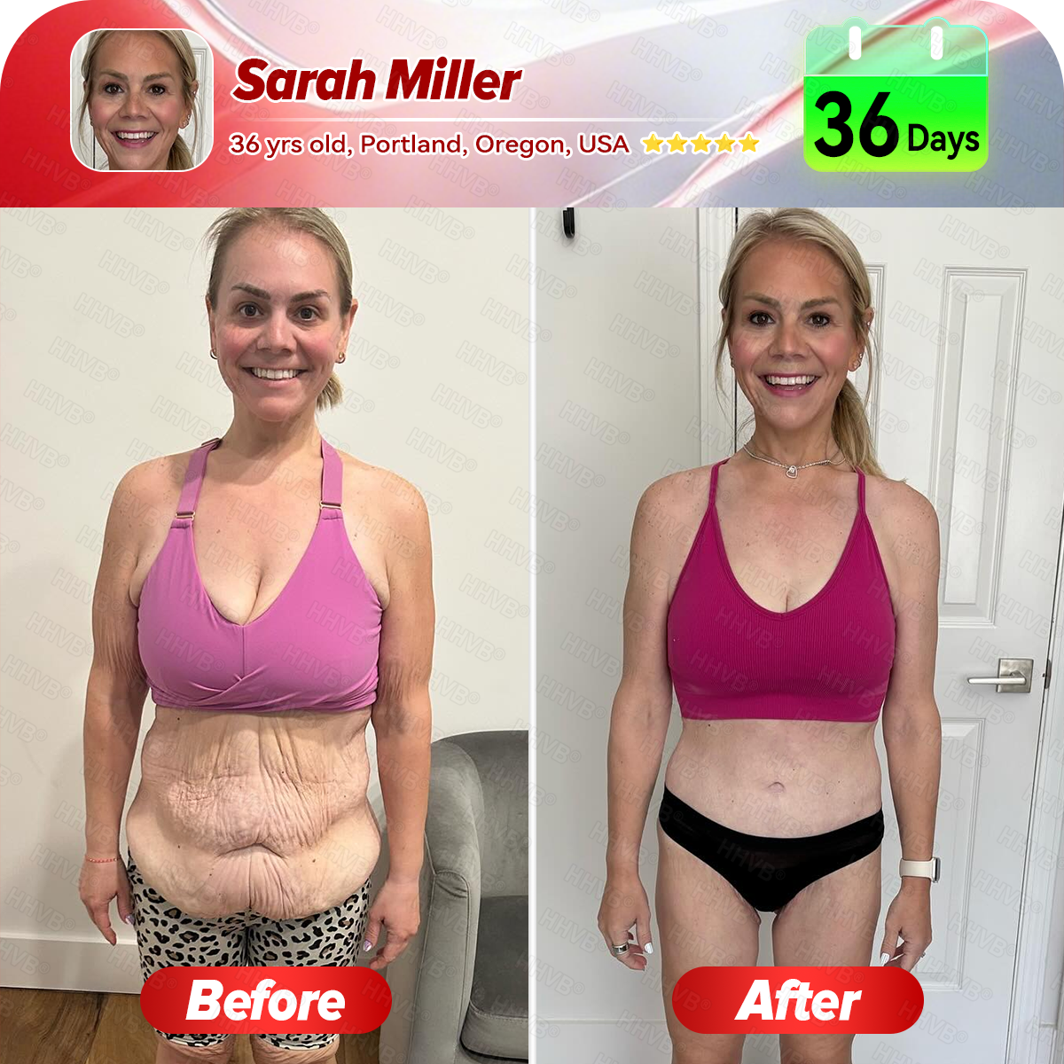 "When I first decided to lose weight, one of my biggest fears was ending up with loose, sagging skin. I’ve seen so many people lose a lot of weight, only to feel even more insecure because of the excess skin left behind. Honestly, that scared me. So I spent a long time searching for something that could help—and that’s when I found HHVB®. It promised not only weight loss but also skin firming, and that’s exactly what I needed.After just a few weeks of taking the oral solution daily, I started noticing real changes. My belly fat began to shrink, and my skin felt tighter and more toned. By the seventh week, I could hardly believe how different I looked—my stomach was flatter, smoother, and my skin had that youthful elasticity again.The best part? I didn’t need any surgery or endless hours at the gym to get these results. Taking the oral solution was simple, painless, and surprisingly effective. I’m no longer afraid to look in the mirror—instead, I’m confident enough to wear my workout clothes and take photos again.This isn’t just about losing weight—it’s a complete transformation, inside and out."——Sarah Miller, 36 years old, Portland,Oregon