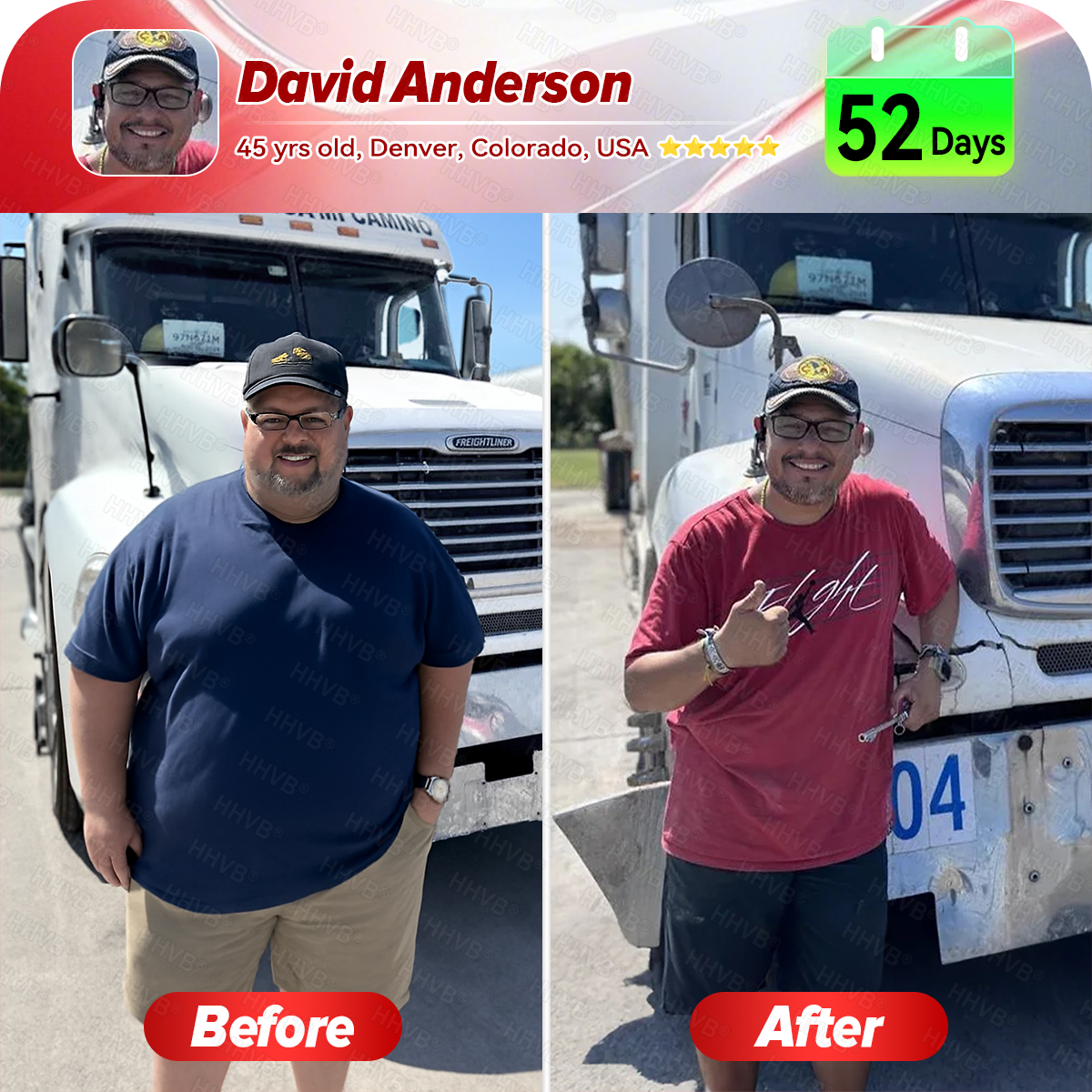 “Carrying over 200 pounds on my body felt like dragging a mountain everywhere I went. I’ve been a truck driver for more than ten years, living on gas-station burgers, energy drinks, and a few beers after every shift. I didn’t think much of it at first—until even the simplest things became a struggle. My back and knees hurt all the time, bending to tie my boots left me breathless, and climbing two flights of stairs felt like running a marathon. The breaking point came one night when I almost dropped my grandson because my body just couldn’t handle the weight anymore. That moment hit harder than any doctor’s warning.I tried walking more and eating less, but nothing worked. Then a friend told me about HHVB® GLP-1 + Collagen Peptides Weight Loss & Firming Oral Solution—no extreme diets, no exhausting workouts. I decided to give it a try. During the first week, I noticed I didn’t need energy drinks to stay awake. By the second week, the scale finally started moving. By the third week, my doctor said my blood sugar and blood pressure were improving.Now I can walk with my wife again without feeling like I’m carrying the world on my shoulders. My clothes fit, my body feels lighter, and my mind feels clear. This isn’t a miracle—it’s a real, sustainable way to reset your body. HHVB® didn’t just help me lose weight—it gave me my life back.”— Michael Anderson, Austin,Texas
